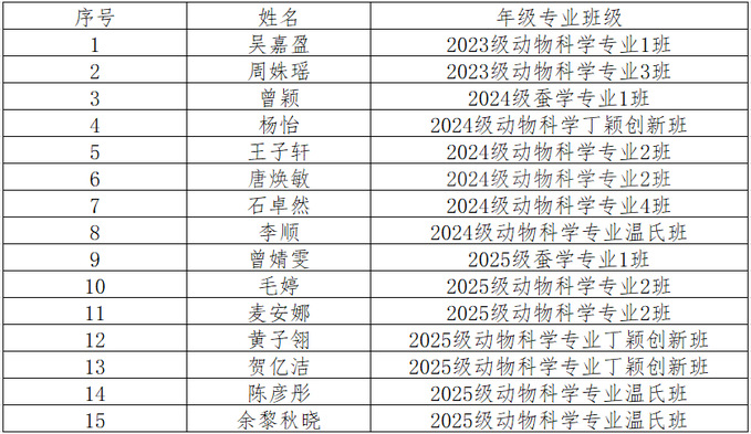 根据校团委2025年团员发展相关通知,经个人报名、团支部推荐、院团委书记谈话等环节了解学生基本情况,动物科学学院团委综合考察,现将2025年下半年参与入团积极分子培训班的名单公示如下: