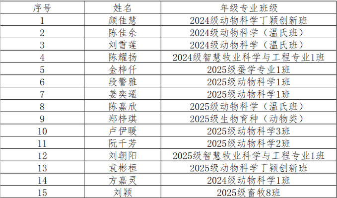 根据校团委2026年团员发展相关通知,经个人报名、团支部推荐、院团委书记谈话等环节了解学生基本情况,动物科学学院团委综合考察,现将2026年上半年参与入团积极分子培训班的名单公示如下: