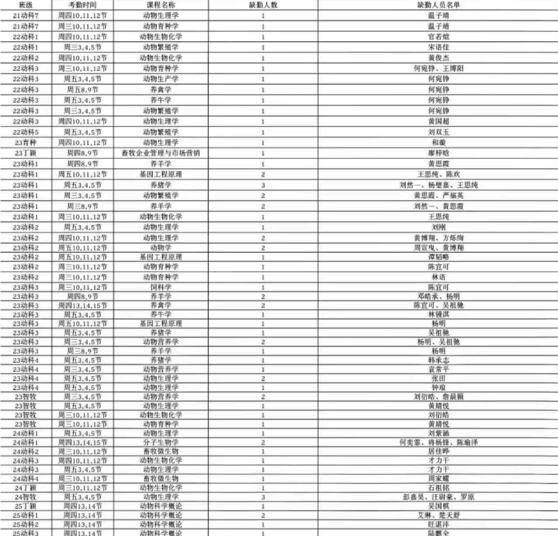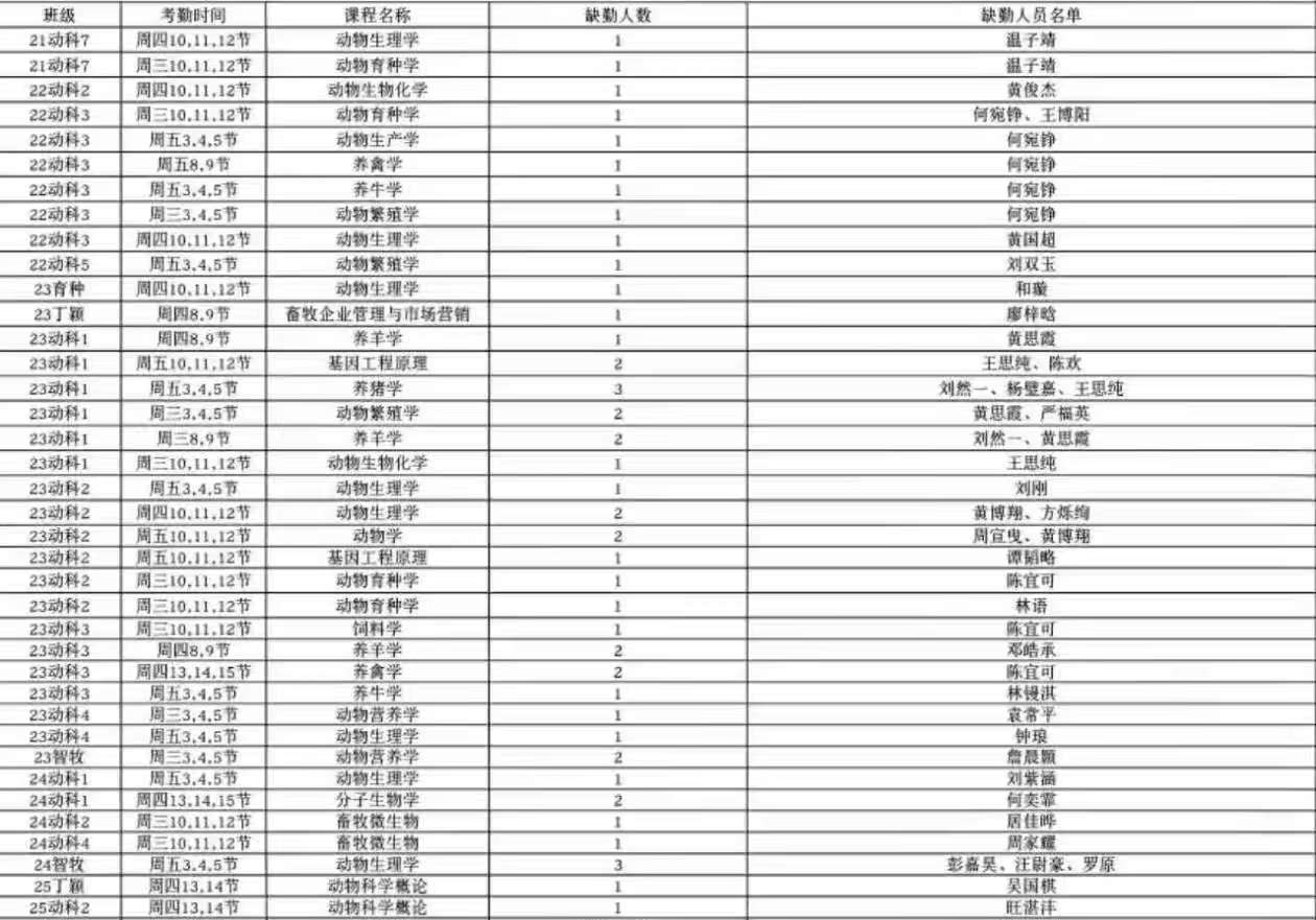 为强化课堂纪律,严肃学风学纪,进一步加强学风建设,营造优良学风院风,2025年10月12日—10月18日,我院教学信息学生委员会对本科生课堂出勤情况进行抽查,现将考勤结果公示如下(以下只列出缺勤班级情况,未列出的班级即为全勤)。