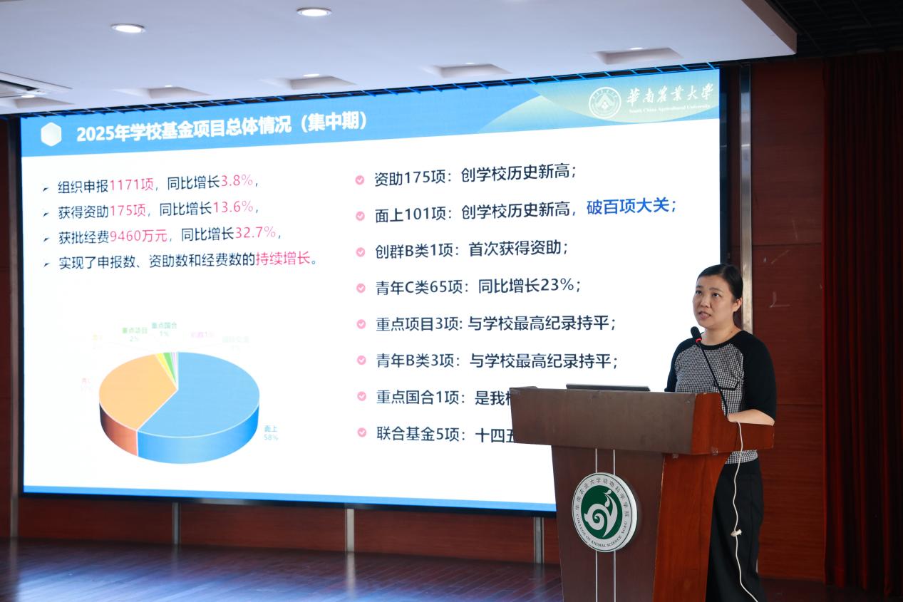 会议伊始,学校科学研究院基础科郑雪宜科长为全体教师作了题为“2026年度国家自然科学基金申报动员会”的专题辅导报告。郑雪宜从基金改革趋势剖析、申请形势精准研判、项目选题创新凝练、申请书撰写核心要领以及评审答辩关键环节等多个维度,系统深入地阐释了提升基金项目竞争力的核心要素。通过剖析一系列典型成功与未获资助的案例,生动分享了如何在遵循学术规范的前提下,巧妙构思科学问题属性、突出创新亮点、严谨设计研究方案,从而显著提升项目申请书质量与命中率的实用策略。