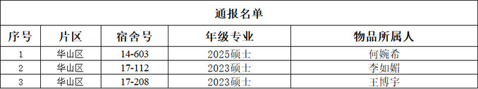 本通报公示截止至2026年4月6日12:00。公示期内,如有异议,请实名联系所在年级辅导员,并提供物品所属人姓名。
