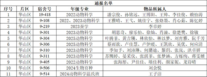 学生宿舍作为学生日常学习生活的重要场所,在宿舍门前等公共区域堆放杂物极易引发安全隐患,甚至危及学生生命财产安全。根据《华南农业大学学生公寓管理规定》,学校本学期第五周巡查通报了在宿舍门前违规堆放物品的学生宿舍。学院决定对学校通报的违规宿舍做如下处理,对违规宿舍和相关学生予以全院通报,并依据动物科学学院本科生综合素质测评管理相关规定,对相关宿舍成员予以综测扣分处理。名单如下: