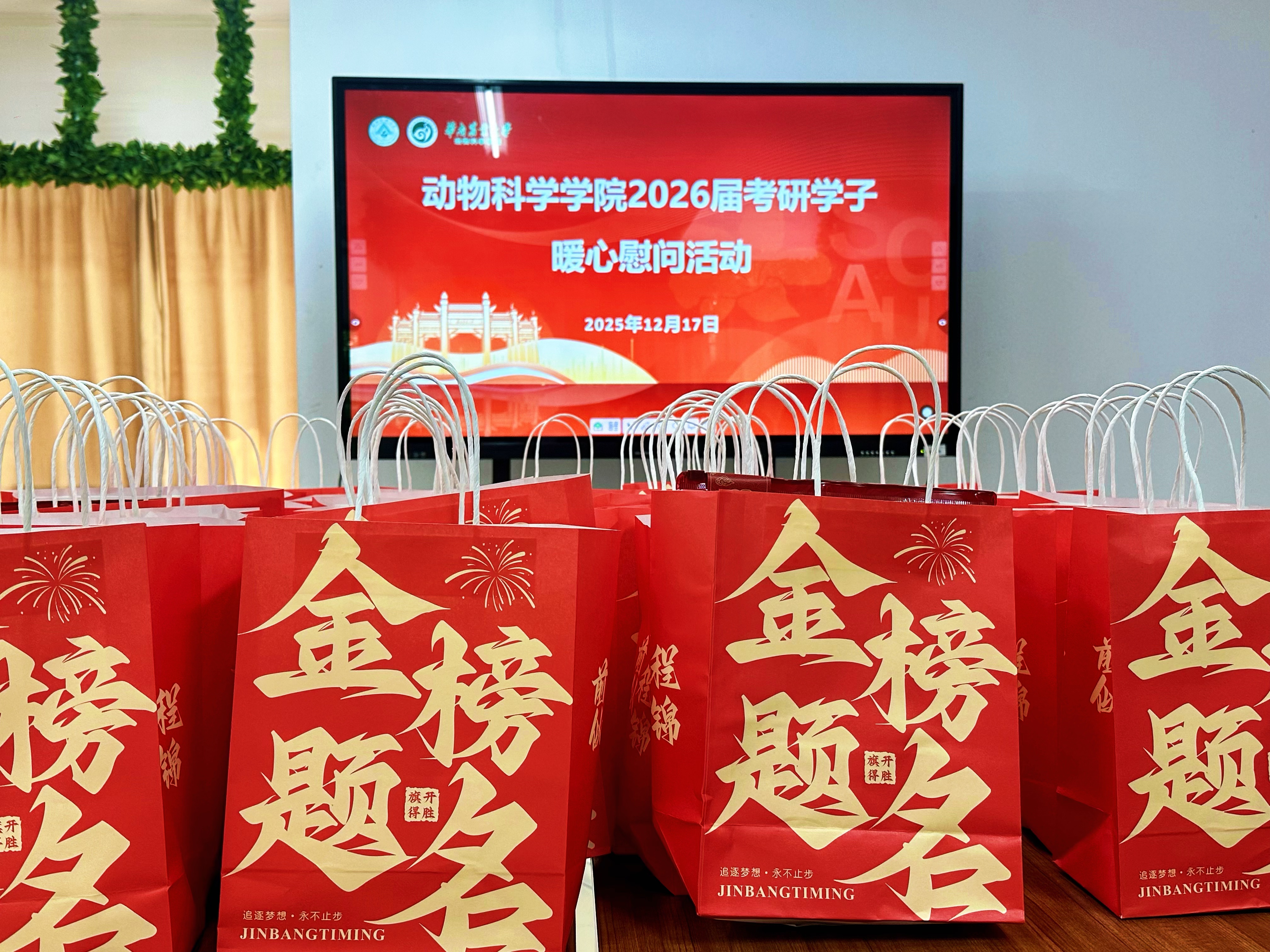 为帮助考研学子在冲刺阶段坚定信心、缓解压力,以最佳状态迎接考试,12月17日中午,动物科学学院在华山区社区党员活动室开展“牧梦扬帆,一战成硕”考研慰问活动。学院谢青梅院长、郭灼副书记、辅导员代表参加活动,为即将踏入考场的学子送上暖心鼓励和诚挚祝福。