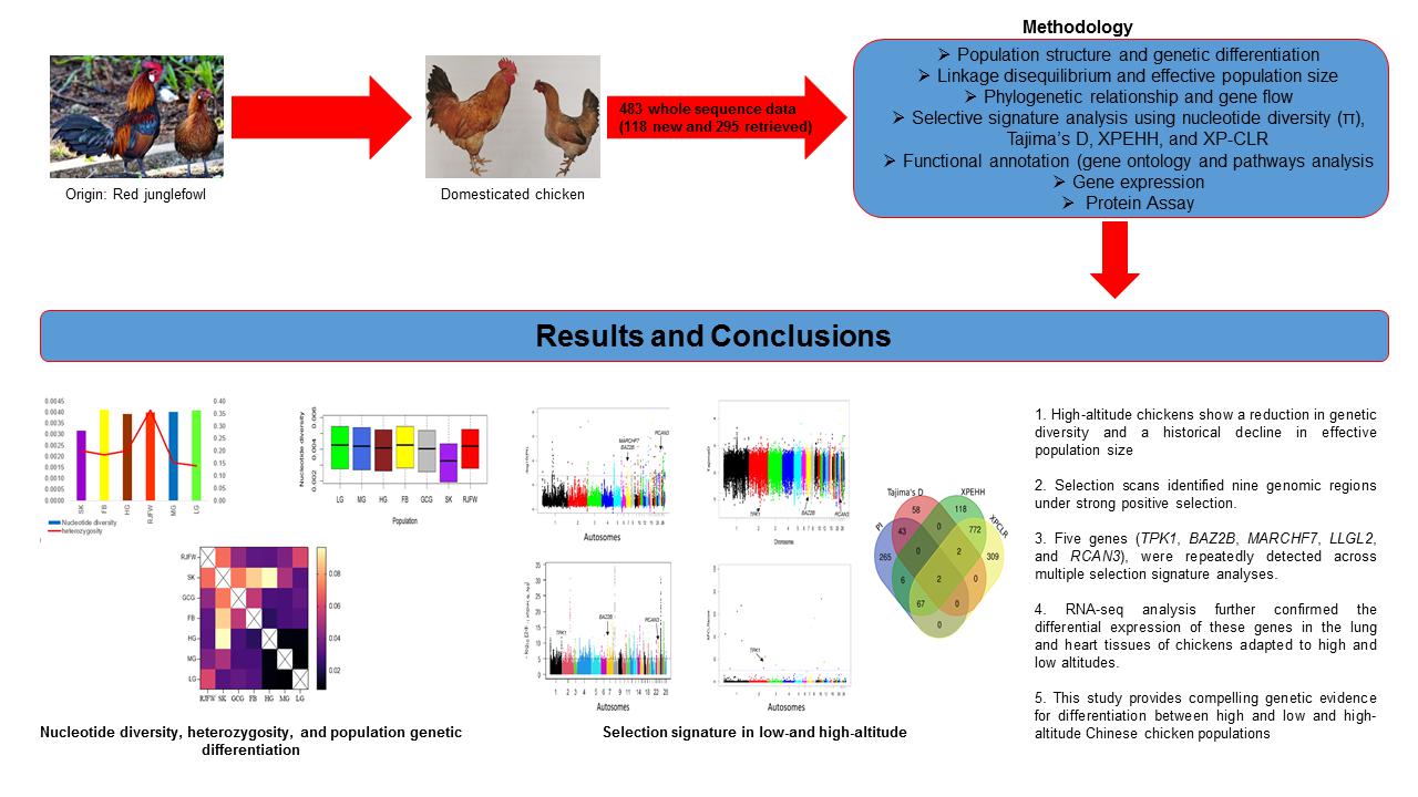 近日,我校动物科学学院家禽遗传育种研究团队在Journal of Advanced Research(中科院一区TOP期刊,最新影响因子13)在线发表了题为“Whole-genome sequencing identifies genetic diversity and adaptive signatures of hypoxia and ultraviolet radiation in Chinese chickens”的研究论文,为高/低海拔鸡种的种群分化提供了遗传学证据。