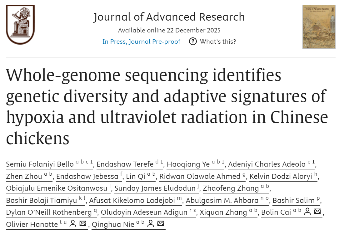 华南农业大学动物科学学院已出站博士后Semiu Folaniyi Bello、埃塞俄比亚阿尔西大学Endashaw Terefe博士、华南农业大学博士生叶浩强和中国科学院昆明动物研究所Adeniyi Charles Adeola博士为论文共同第一作者,华南农业大学聂庆华教授、英国诺丁汉大学Olivier Hanotte教授和华南农业大学蔡柏林副教授为该论文的共同通讯作者,张细权教授为共同作者。该研究得到了国家重点研发计划项目、农业生物育种国家科技重大专项、广东特支计划畜禽种业自主创新团队项目等项目的资助。