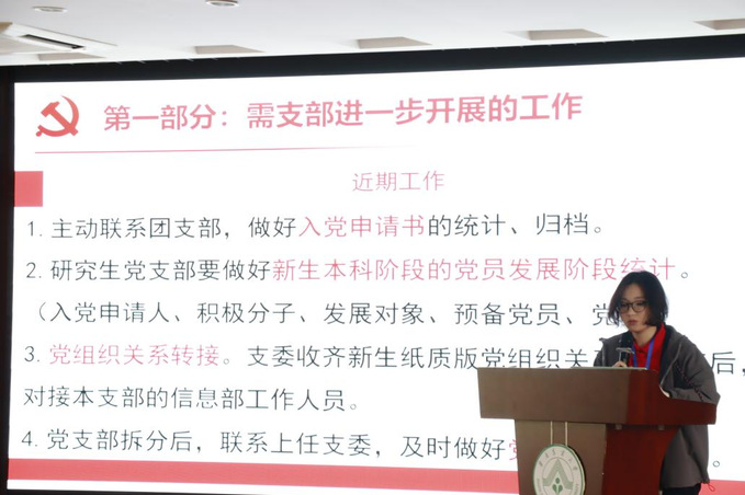 针对党员发展流程规范化管理,谢钰颖详细讲解了党员发展流程,党支部近期主要工作,并就思想汇报的撰写要求、政治审查的具体操作、支部大会的程序规范、材料归档的细节等问题与支委进行交流答疑。
