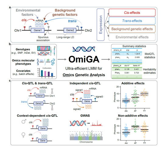 分子QTL定位是解析生物复杂性状与疾病遗传调控机制的核心手段。然而,现有工具多依赖简单线性模型,难以适配复杂亲缘关系分析场景,常面临假阳性偏高、统计效力不足的瓶颈。针对这一难题,团队搭建了稳健的方法体系并开发了拥有自主知识产权的OmiGA工具。OmiGA功能体系完备,当前包含两大核心模块:一是分子QTL定位模块,支持顺式(cis)、反式(trans)及环境依赖效应分析,可精准解析加性、非加性遗传效应;二是高通量分子表型遗传力估计模块,能实现加性和非加性效应下,顺式、反式及全基因组层面的遗传力精准测算。