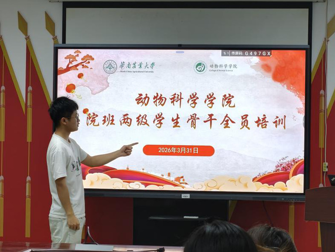 为深入贯彻落实立德树人根本任务,进一步加强院班两级学生骨干队伍建设,提升学生骨干的综合素养、业务能力和履职水平,深化院班协同工作格局,充分发挥学生骨干在自我管理、自我服务、自我教育中的模范带头作用,激发学院学生工作的创新活力和发展动力,2026年3月31日,动物科学学院研究生会于动科新楼512室举办院班两级学生骨干全员培训活动。研究生会成员以及各班级学生骨干代表共31人参加了本次培训。
