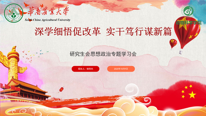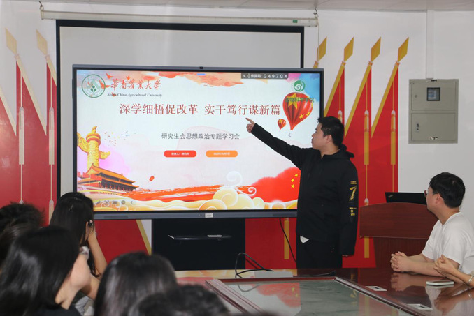 当前,改革发展进入攻坚期,统一思想、凝聚共识的任务愈加紧迫。为深入贯彻落实上级关于全面深化改革的决策部署,引导全体干部职工准确把握改革方向、增强改革定力,2025年10月9日,动物科学学院研究生会以“深学细悟促改革 实干笃行谋新篇”为主题,组织召开思想政治专题学习会。