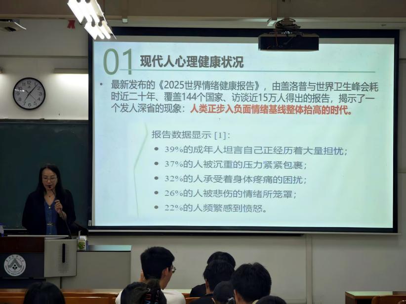 培训伊始,蔡老师结合《2025世界情绪健康报告》,带领宿舍长们正视当下大学生心理健康面临的普遍挑战。报告显示,全球范围内39%的成年人正经历大量担忧、37%被沉重压力裹挟,而高校学生群体也同样面临学业、人际、环境适应等多重情绪压力,负面情绪基线整体抬升,心理健康关怀已成为校园管理的重要课题。随后,蔡老师通过许多实际案例,生动形象地讲解了心理冲突的常形与变形,帮助同学们识别常见的心理困扰类型。